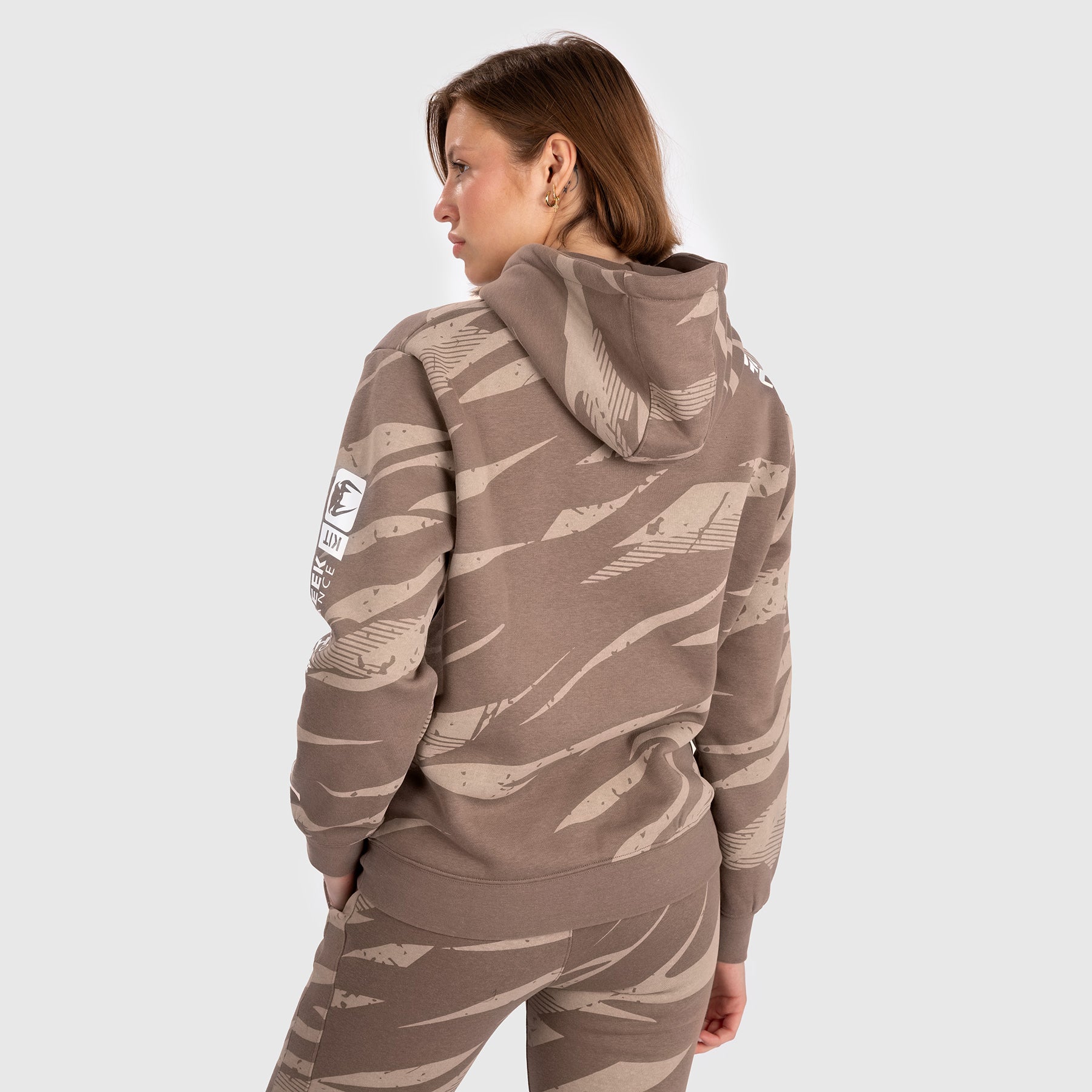 The UFC Adrenaline by Venum Fight Week Women’s Pullover Hoodie in Desert Camo features Venum and UFC logo detailing in white on the chest, shoulder and down the full length of the left arm.