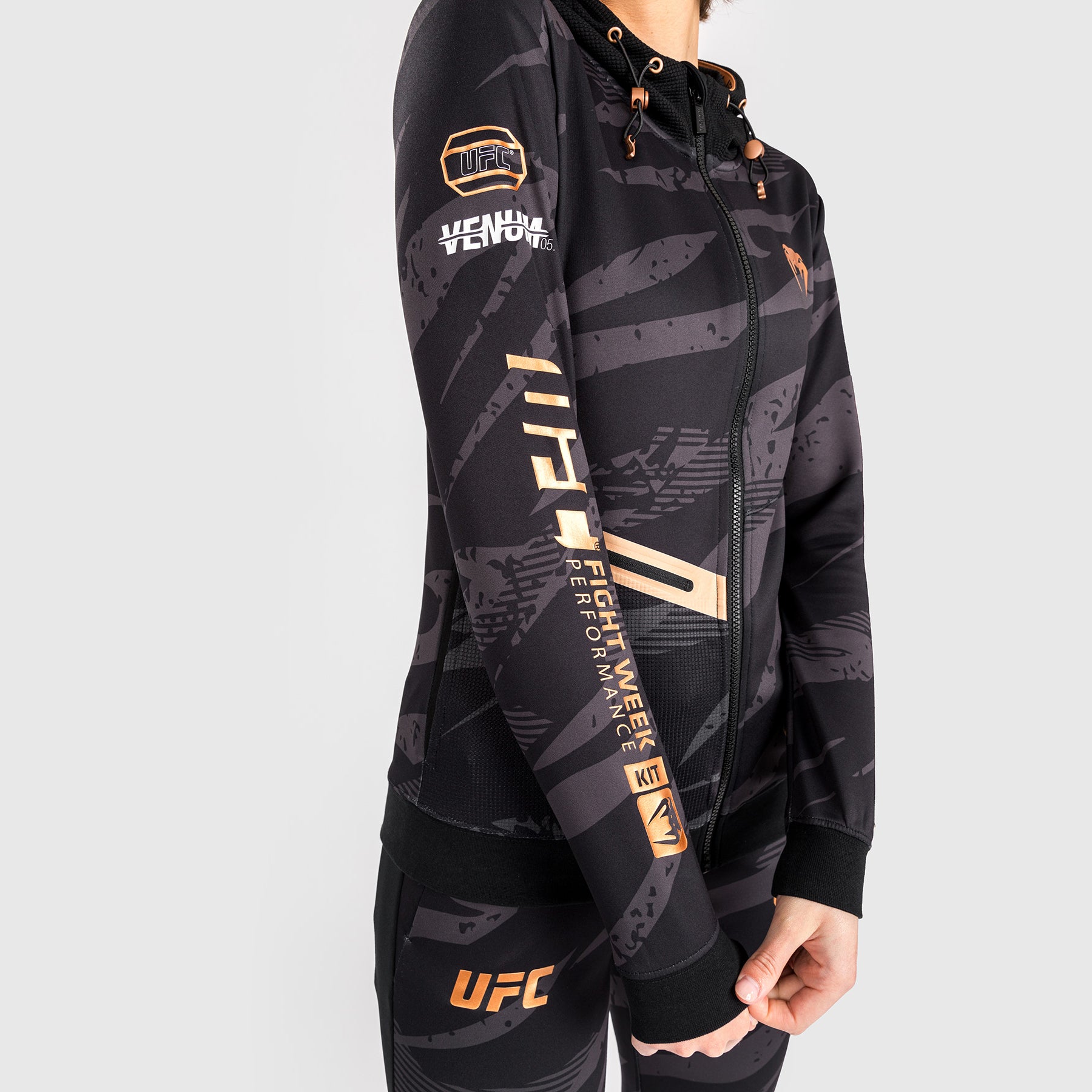 The UFC Adrenaline by Venum Fight Week Women’s Zip Hoodie features open pockets and two asymmetric zippered pockets.