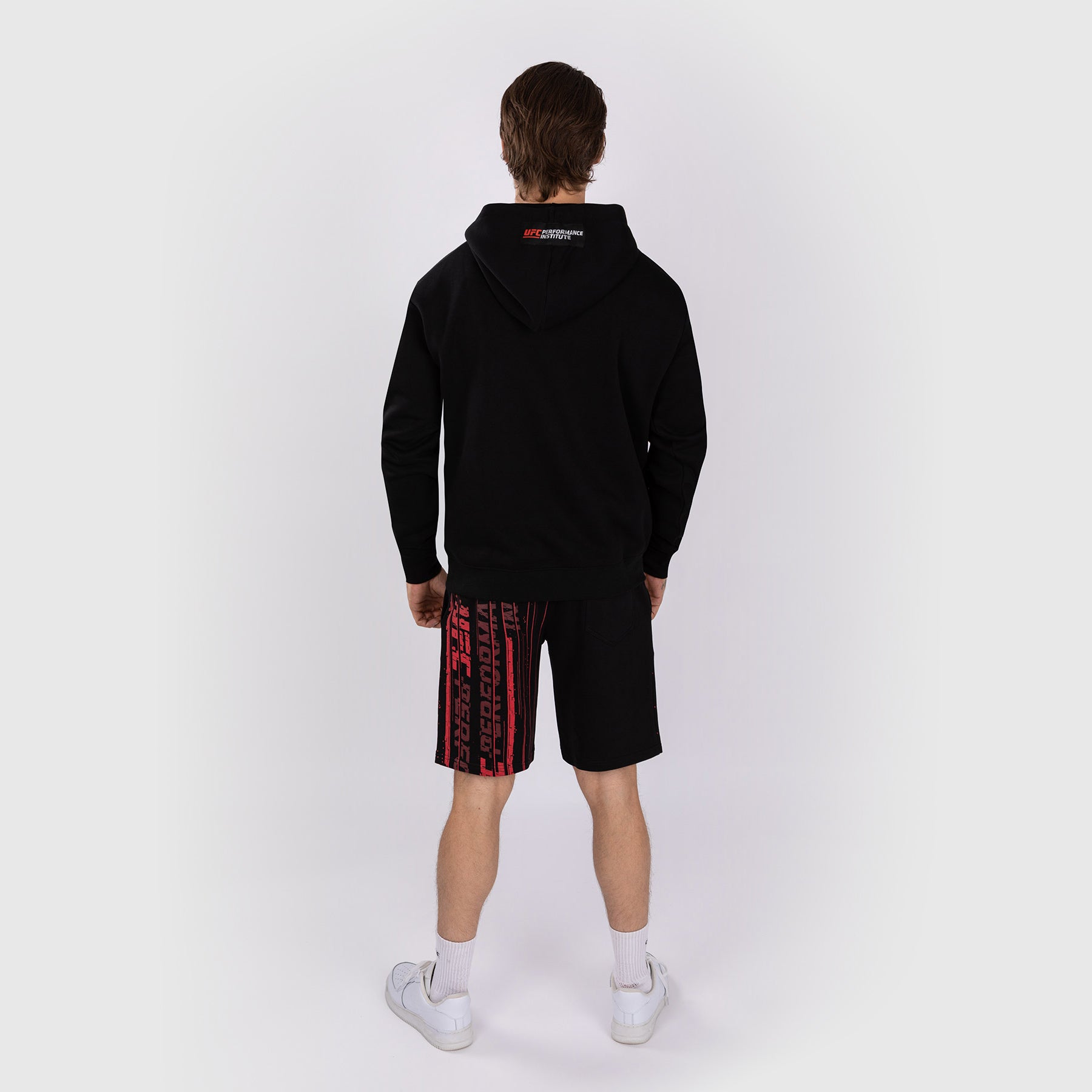 The black hoodie features the collection’s dynamic red and white graphic design, plus the UFC Performance Institute and Venum logos at the chest. A UFC Performance Institute patch sits at the back of the hood.