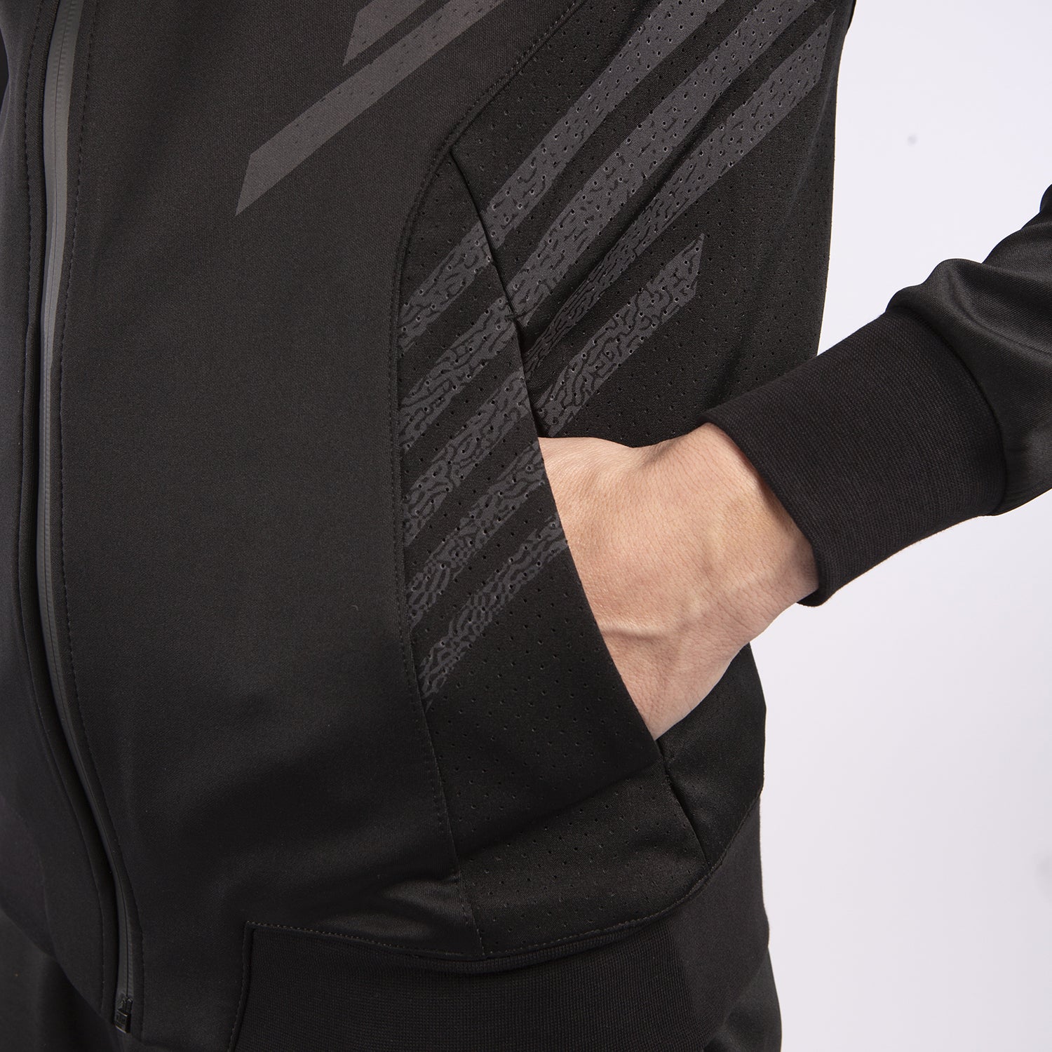 This unique composition offers you maximum comfort and total freedom of movement, allowing you to keep this hooded jacket on during your warm-up. Its waterproof side pockets and bold graphics give this sweatshirt a unique look.