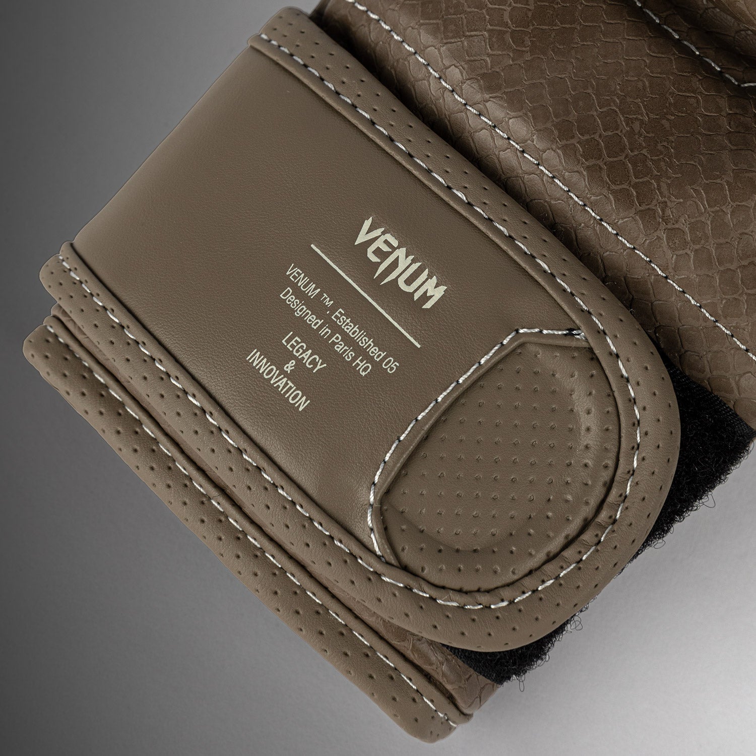 Beige stitching follows the lines of the glove’s anatomical construction for a subtle contrast effect. Meanwhile textured scales spread across the surface - a reminder to strike hard and fast with Venum.
