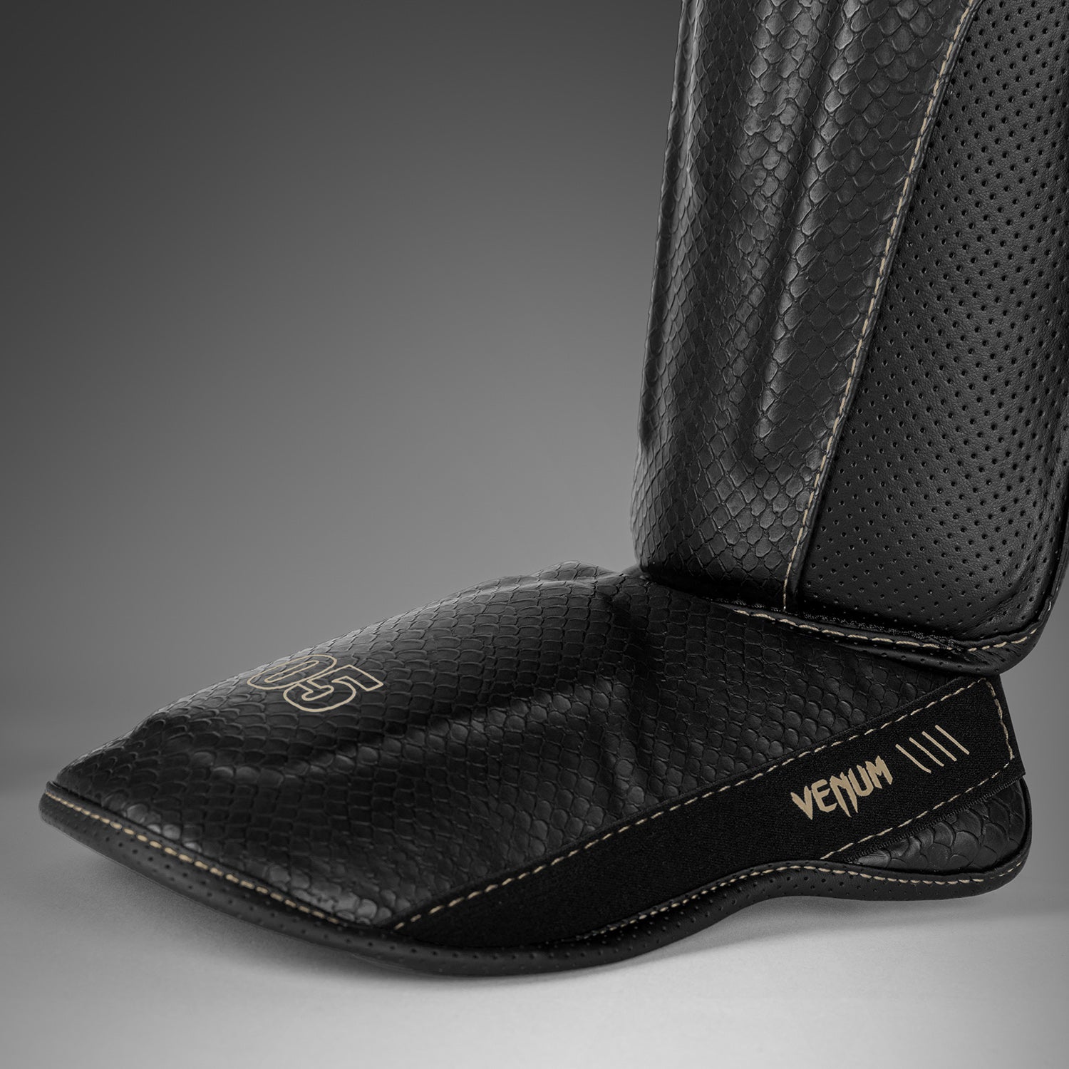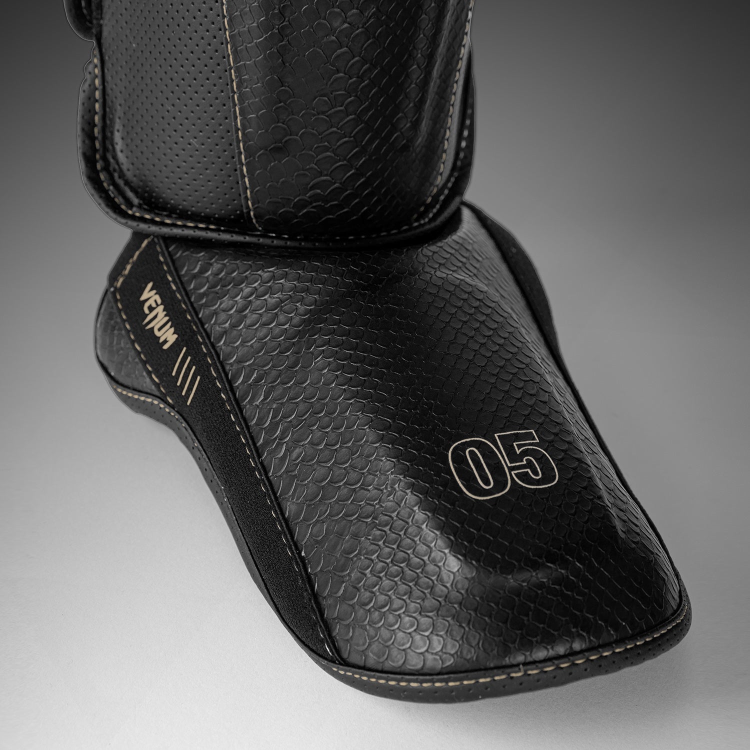 These striking shin guards feature beige stitching along the lines of their anatomical construction for a subtle contrast effect. Meanwhile textured scales spread across the surface - a reminder to strike hard and fast with Venum.