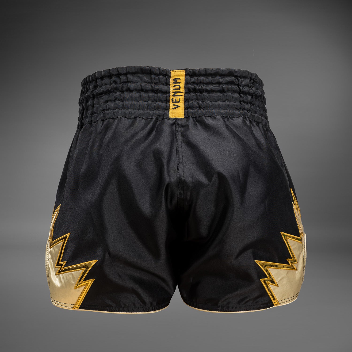 A gold reflective patch with “Venum” sits across the front of the short and front belt. Meanwhile, flames, also in gold, reach up the sides of the shorts.