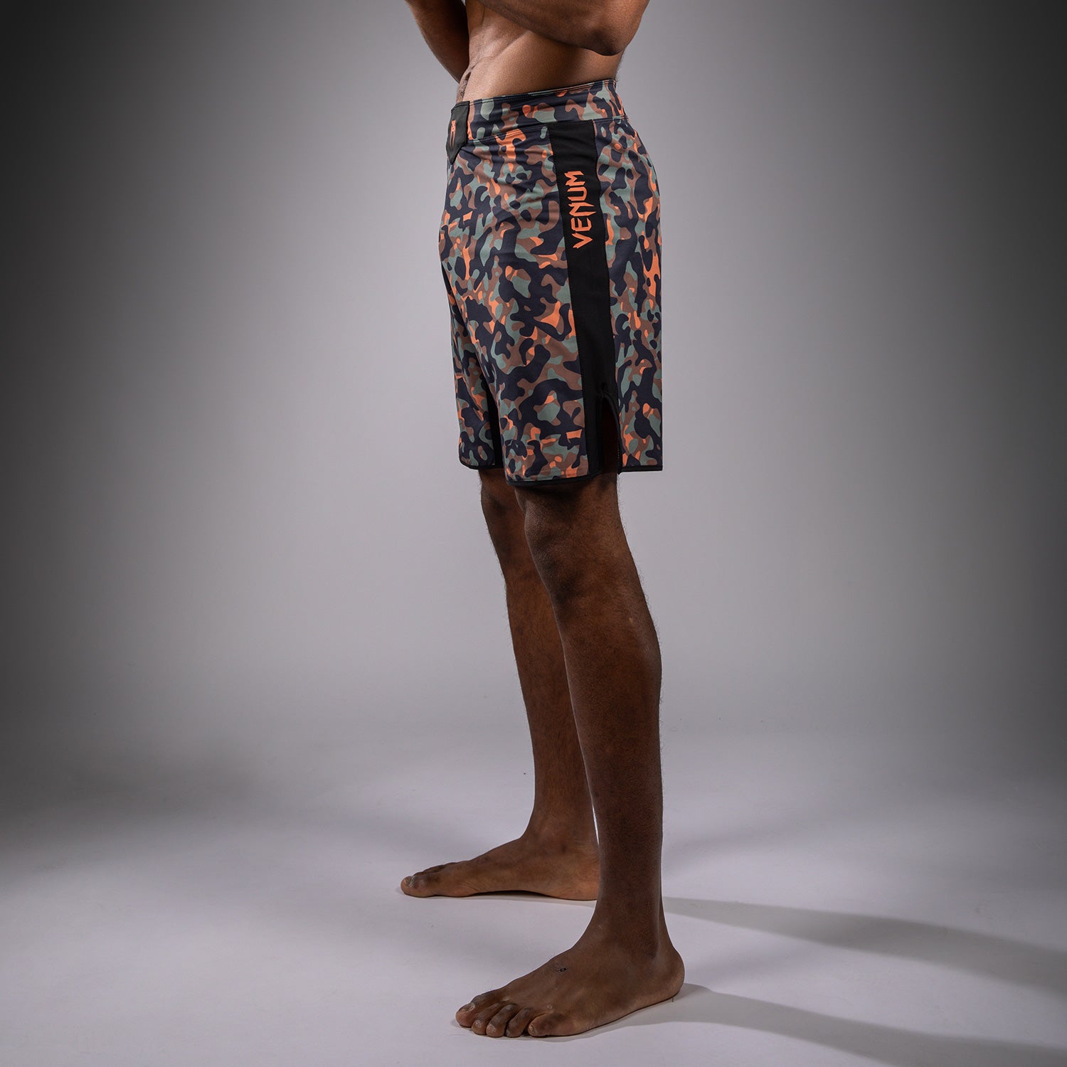 The Venum Jungle Ops Men’s Fight Shorts in Canyon Camo are a long fit short, featuring thermo-glued side slits for greater freedom of movement during standing and ground work. Its fabric is lightweight, durable and flexible, while the elasticated waistband delivers a secure fight - the ideal short for combat sports.