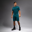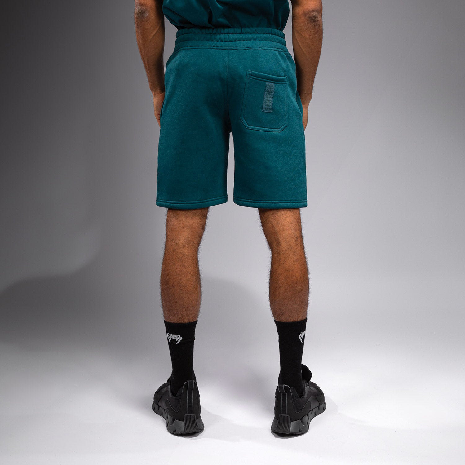 The Silent Power Shorts in Paon Green features open side pockets and back pocket with a logo motif. The drawstring waistband offers a secure, comfortable fit.