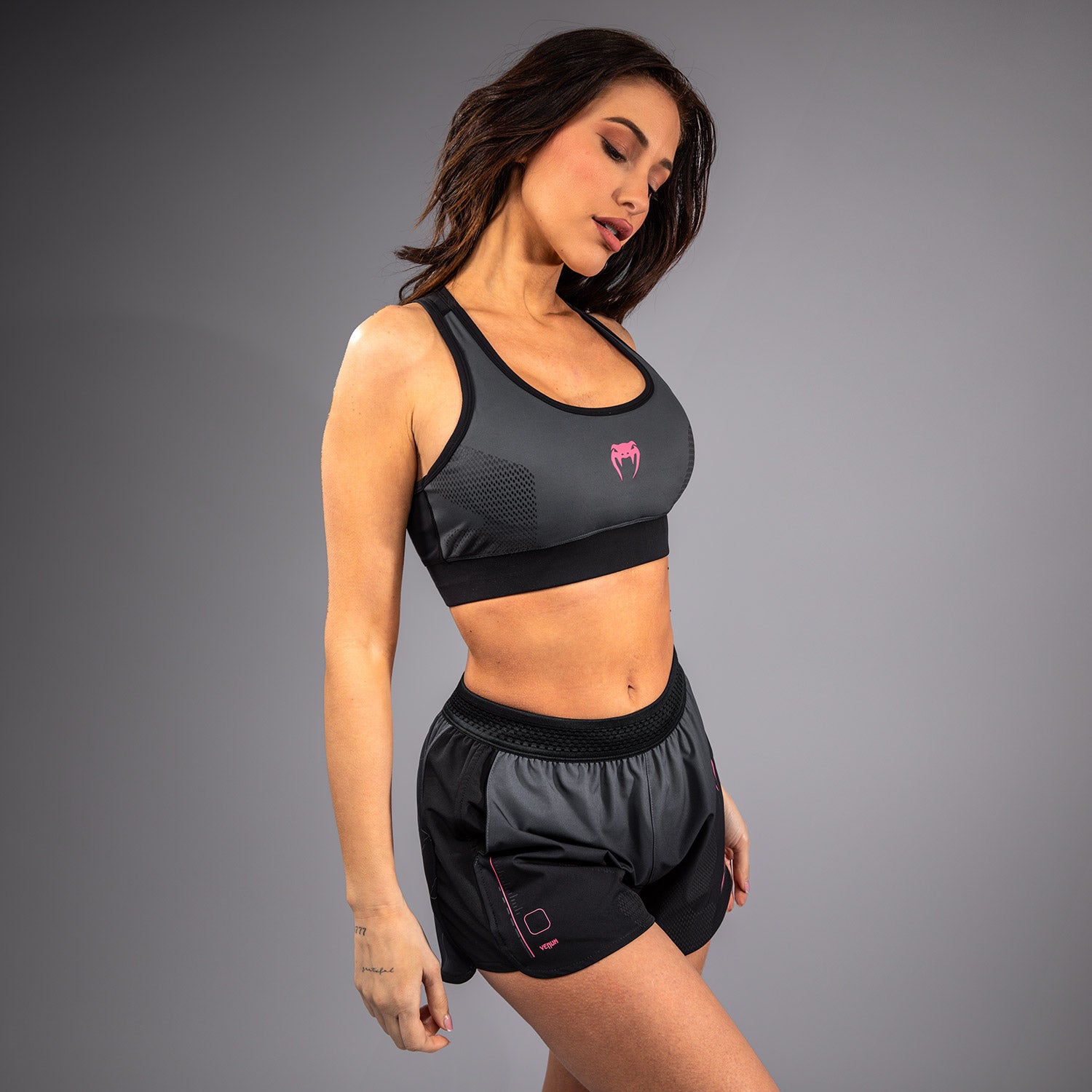 This women’s sports bra has been designed with a sleek black-grey base accented by dynamic graphics in pink.