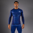 The Venum Technical 3.0 Long Sleeve Rashguard in Night Blue is a compressive long sleeve rashguard featuring a sleek futuristic design in dark blue and black, with the Venum logo at the chest.