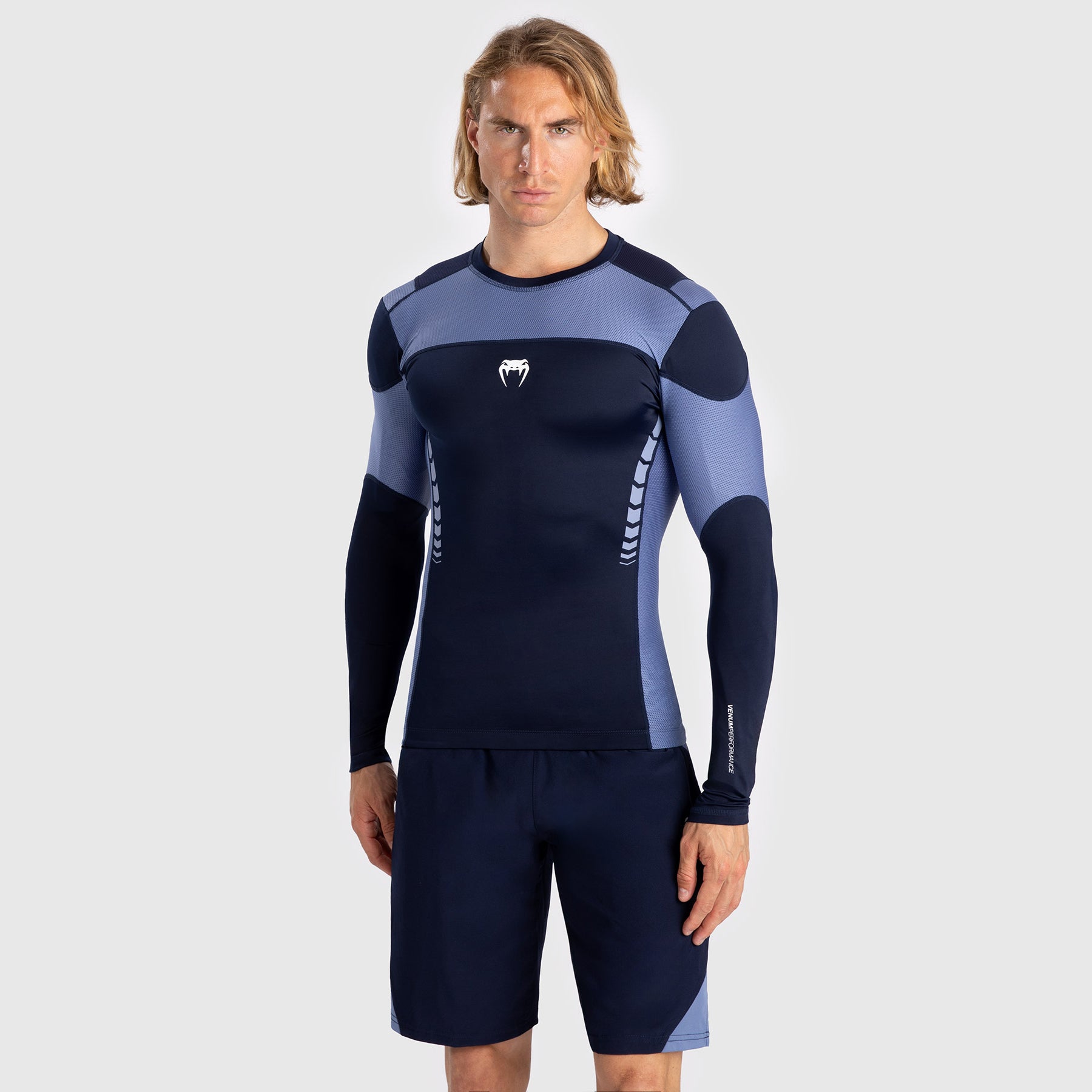 The Venum Tempest Men’s Long Sleeve Rashguard in navy blue/blue serves as a second skin to provide protection against injury and freedom of movement during grappling. The rashguard’s compression technology also helps encourage muscular recovery.