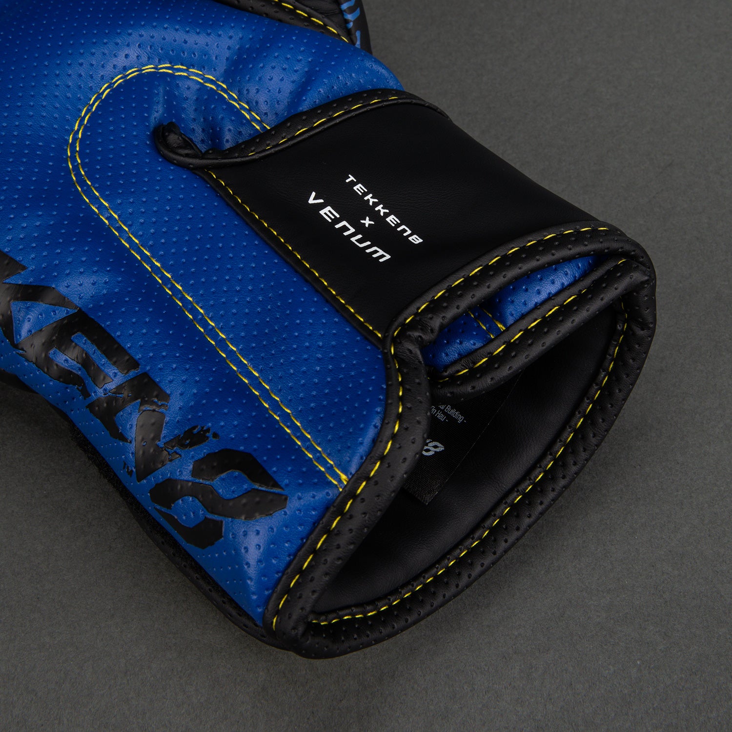 The Venum x TEKKEN 8 Boxing Gloves - King reflect King's lucha-libre identity through the signature blue, yellow, and black color scheme and bold patch-style graphics, similar to those on his wrestling gear. The crown and jaguar motifs directly reference his mask and pro-wrestler persona.